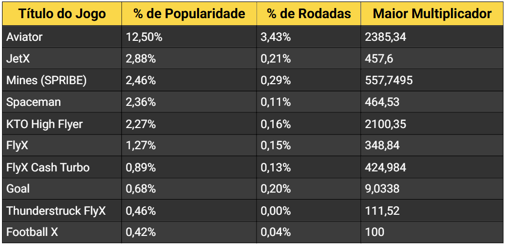 Já KTO High Flyer se manteve estável com 2,27%, enquanto FlyX e FlyX Cash Turbo registraram pequenas oscilações, mas garantiram presença no Top 10.