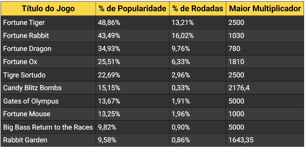 Na segunda posição, Fortune Rabbit também apresentou crescimento, subindo de 32,49% para 43,49% de popularidade, além de liderar novamente em número de rodadas jogadas — agora com 16,02%. A disputa entre os animais sortudos segue acirrada, com Fortune Dragon consolidando-se no Top 3 ao alcançar 34,93% de popularidade, superando Tigre Sortudo, que ocupava esse lugar em março.