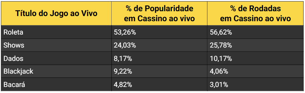 E se olharmos apenas para o cassino ao vivo, veremos que mesas de roleta e game shows têm mais fãs.