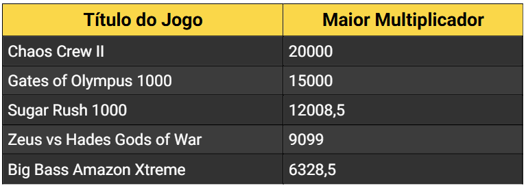 Big Bass Amazon Xtreme apareceu como novidade na lista com 6.328,5x, substituindo Viking Forge e 5 Lions Megaways 2, que deixaram o Top 5 após figurarem entre os maiores no mês anterior.