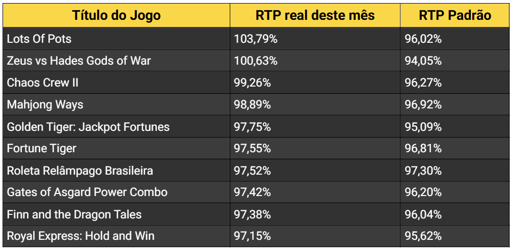 Aqui está uma lista de jogos com a maior RTP real deste mês que você não vai querer perder, em comparação com as RTPs padrão destes mesmos jogos: