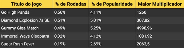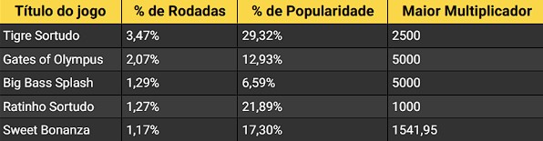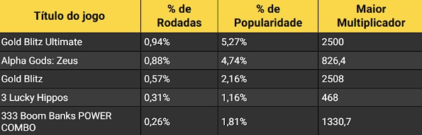 Outro destaque foi a estreia de Bingote no Top 5, com 0,87% de popularidade e um multiplicador de 744,75x, mostrando que novos títulos têm ganhado espaço rapidamente.