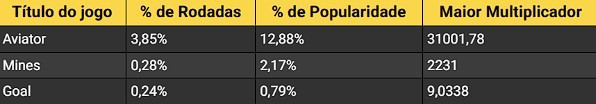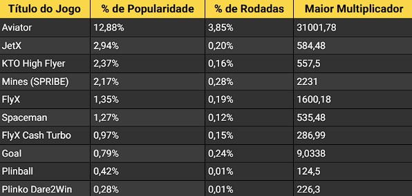 Outros jogos como KTO High Flyer e FlyX tiveram quedas leves na popularidade, passando de 5,17% para 2,37% e de 2,57% para 1,35%, respectivamente.