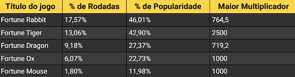 Jogos como Fortune Dragon e Fortune Ox, mantiveram-se estáveis no Top 5, com pequenas variações na popularidade.