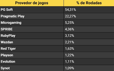 Microgaming perdeu espaço, caindo de 11,75% para 5,25%, mas manteve a terceira posição. Já a SPRIBE subiu de 5,94% para 4,36%, garantindo-se entre os cinco mais jogados.