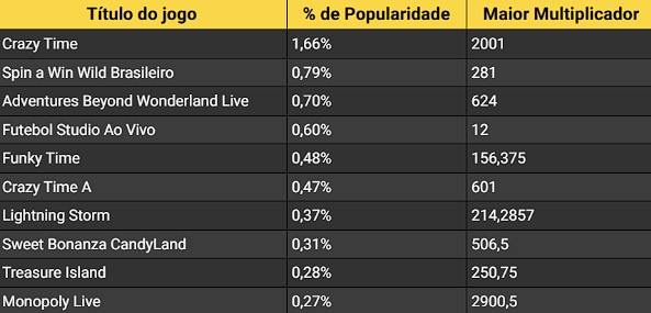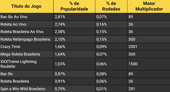 O destaque entre as novidades foi Spin a Win Wild Brasileiro, que estreou no Top 10 com 0,79% de popularidade e um multiplicador de 281x, mostrando que os jogadores gostam muito dos jogos ao vivo em português.