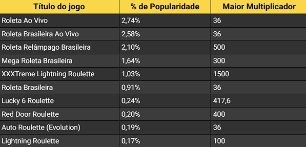 Mega Roleta Brasileira também teve uma leve queda em popularidade, de 2% para 1,64%.