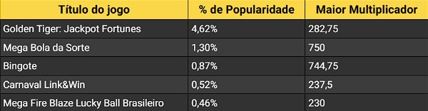 Já os demais jogos, como Carnaval Link&Win e Mega Fire Blaze Lucky Ball Brasileiro, permaneceram relativamente estáveis no ranking, com pequenas variações em popularidade e multiplicadores.