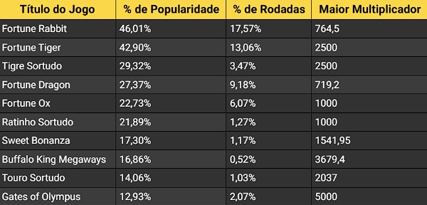 Tigre Sortudo, da Pragmatic Play, apresentou uma queda leve na popularidade, passando de 34,12% para 29,32%, mas manteve-se relevante no Top 3.