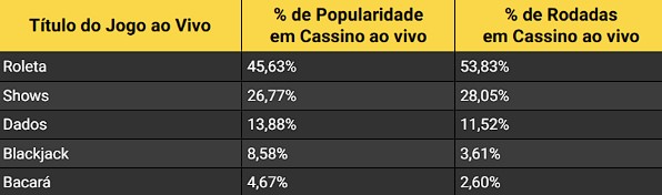 E se olharmos apenas para o cassino ao vivo, veremos que mesas de roleta e game shows têm mais fãs.