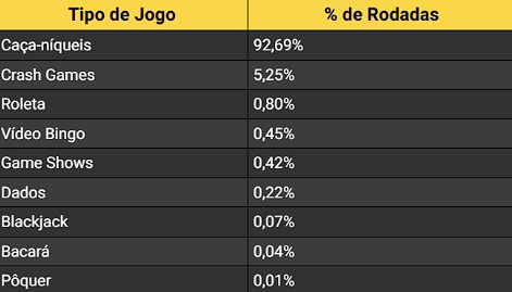 Em contrapartida, os crash games perderam espaço, caindo de 7,15% para 5,25%, indicando que os jogadores estão preferindo os caça-níqueis.