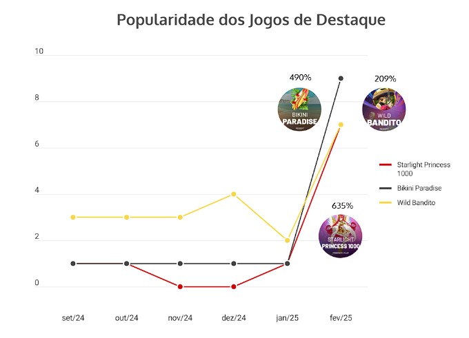 - Starlight Princess 1000 foi o grande destaque, subindo da 112ª para a 17ª posição em fevereiro.