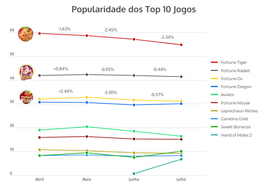 Fortune Mouse e Fortune Ox também experimentaram um declínio notável na popularidade de junho a julho, de 6,43% e 1,80%, respectivamente.