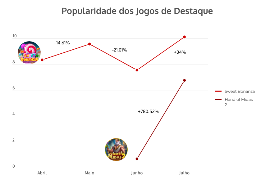 Em comparação com o mês passado, não houve mudanças no top 5 dos jogos mais populares. No entanto, no top 10 de julho, Hand of Midas 2 substituiu Gates of Olympus 1000.