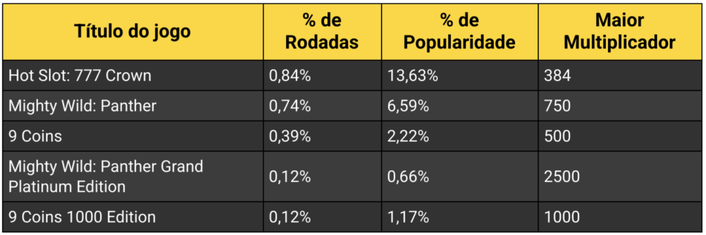 Entre as novidades, Jeitinho Brasileiro estreou com 15,99%, mostrando a força de temas locais, enquanto Hot Slot: 777 Crown apareceu pela primeira vez no Top 10 com 13,63%.