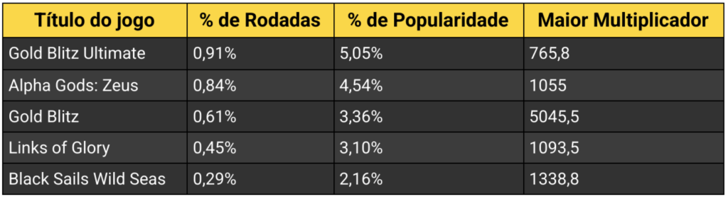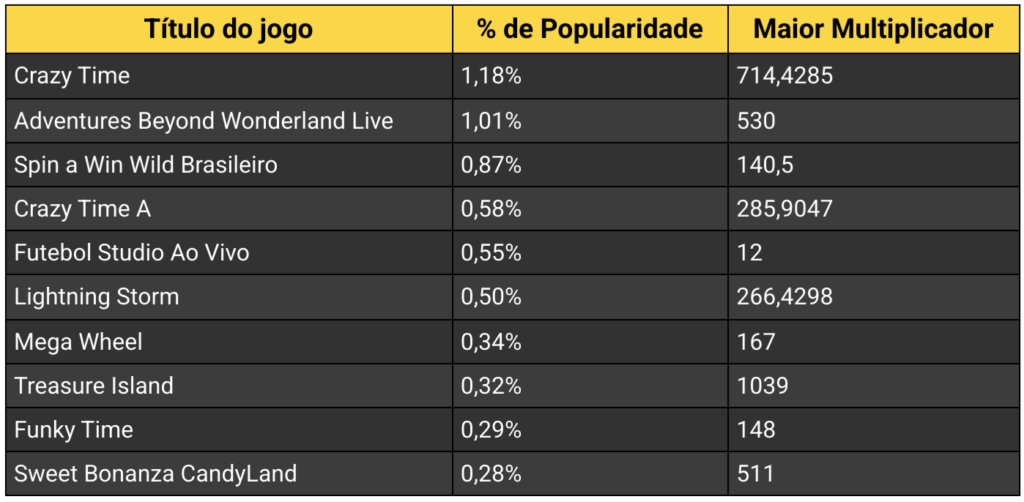 Crazy Time, por sua vez, caiu de 1,66% para 1,18% em popularidade e viu seu multiplicador máximo cair de 2001x para 714,43x, embora ainda impressione como opção entre os game shows.