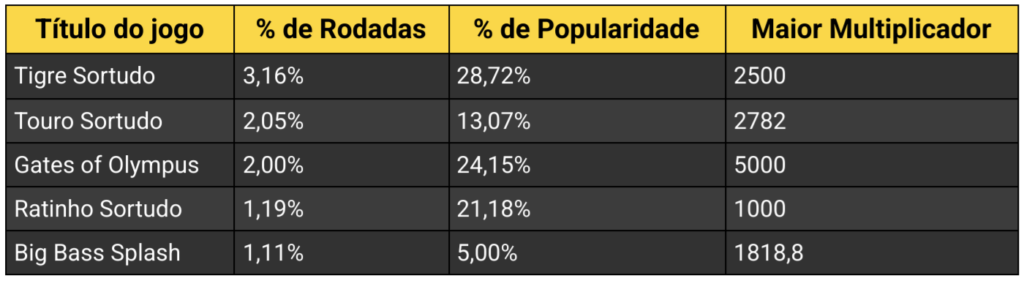 Gates of Olympus, por sua vez, se recuperou em popularidade, subindo de 12,93% para 24,15%, mas teve queda no número de rodadas, indicando um interesse mais concentrado.