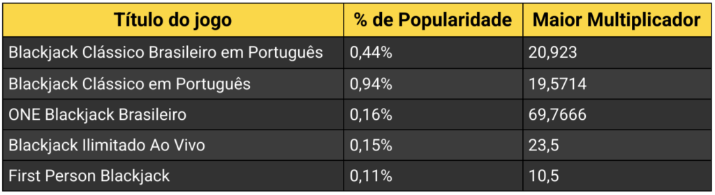 Blackjack Clássico Brasileiro em Português permaneceu estável em popularidade, mas teve melhora significativa no multiplicador, passando de 12x para 20,92x.