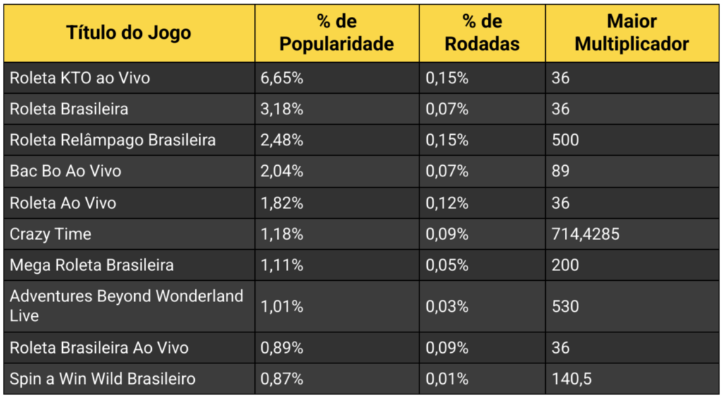 Esses dados mostram que, embora as mesas de roleta continuem dominando, títulos como Bac Bo Ao Vivo e estreias como Roleta KTO Ao Vivo mostram que o cenário dos jogos ao vivo está mais competitivo e variado do que nunca.