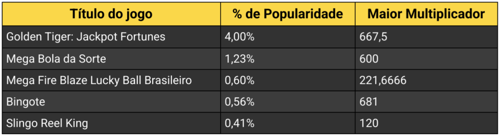 Roleta Relâmpago Brasileira também teve um bom desempenho, subindo de 2,10% para 2,48% em popularidade, mantendo seu alto multiplicador de 500x e uma base fiel de jogadores.