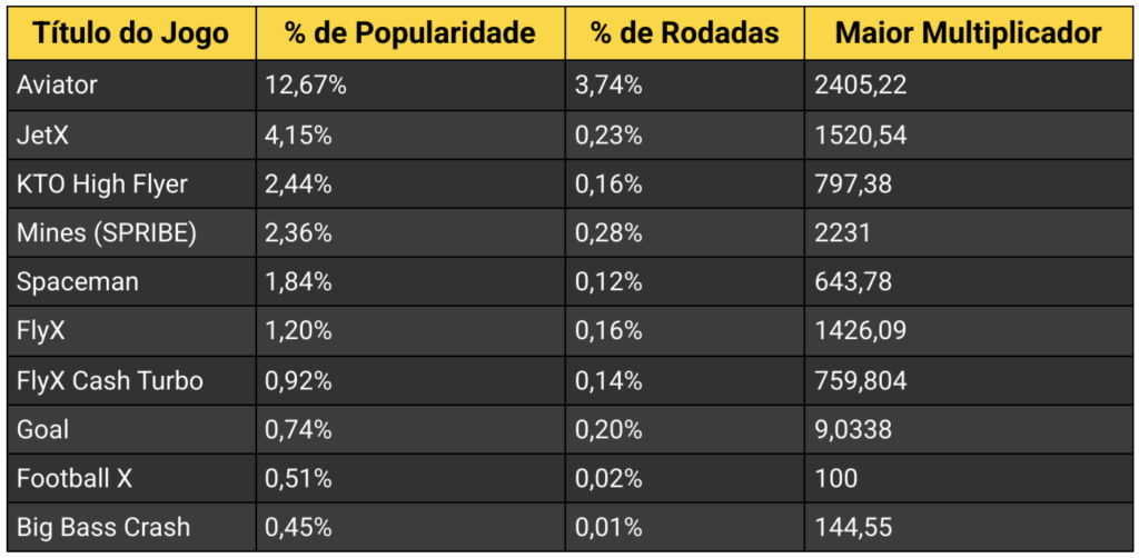 Nós analisamos todos os jogos na KTO e os classificamos de acordo com métricas como popularidade, tempo de jogo e maiores vitórias. Esta pesquisa mensal – baseada em nossos próprios big data de jogabilidade e comportamento do jogador – nos permite detalhar para você: