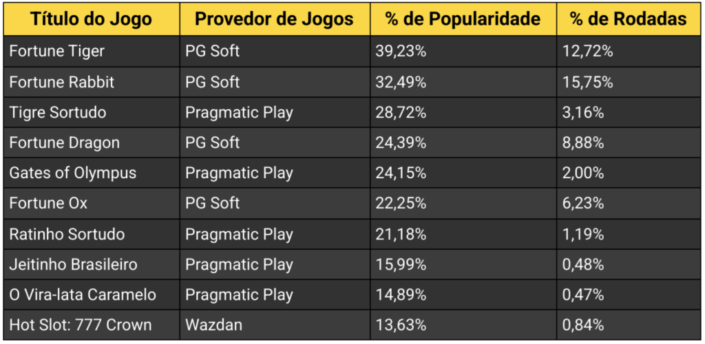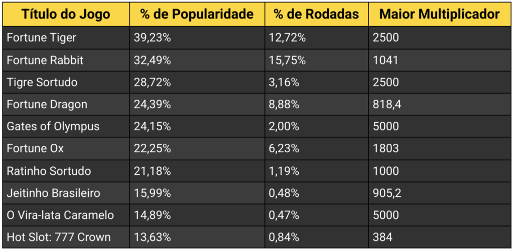 Fortune Tiger recuperou a liderança, com 39,23% de popularidade e crescimento no número absoluto de rodadas.