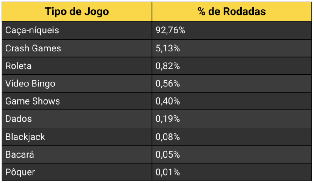 Os caça-níqueis continuam dominando, representando 92,76% das atividades no cassino. Já os crash games, liderados por Aviator, seguem firmes entre os favoritos, garantindo emoções fortes para os jogadores mais ousados.