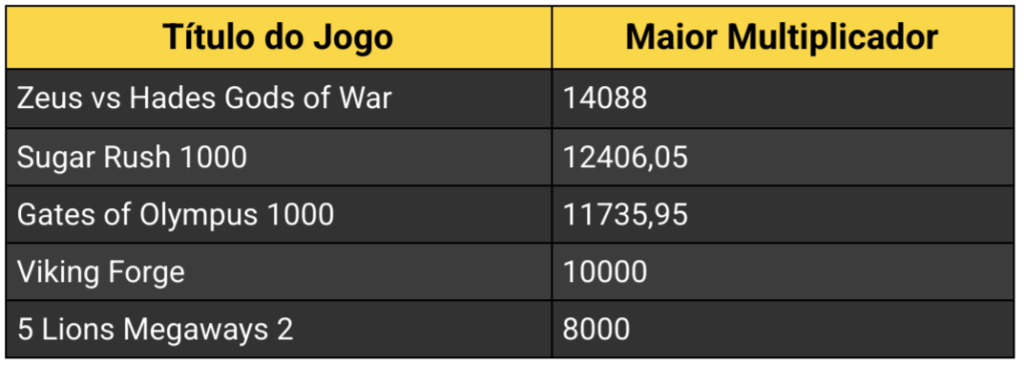 O maior multiplicador de março foi registrado por Zeus vs Hades Gods of War, com 14.088x, uma leve queda em relação ao mês anterior, quando alcançou 15.000x. Mesmo assim, o jogo segue como um dos mais consistentes em potencial de pagamento.