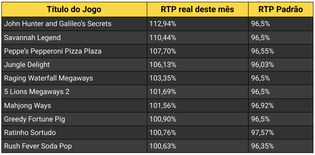Aqui está uma lista de jogos com a maior RTP real deste mês que você não vai querer perder, em comparação com as RTPs padrão destes mesmos jogos: