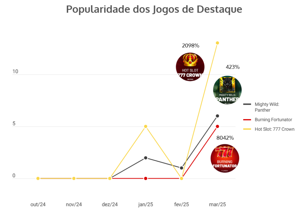 - Burning Fortunator, da Playson, foi o grande destaque do mês: saiu da 615ª posição em fevereiro direto para o 20º lugar — uma ascensão de 595 posições que chamou a atenção.