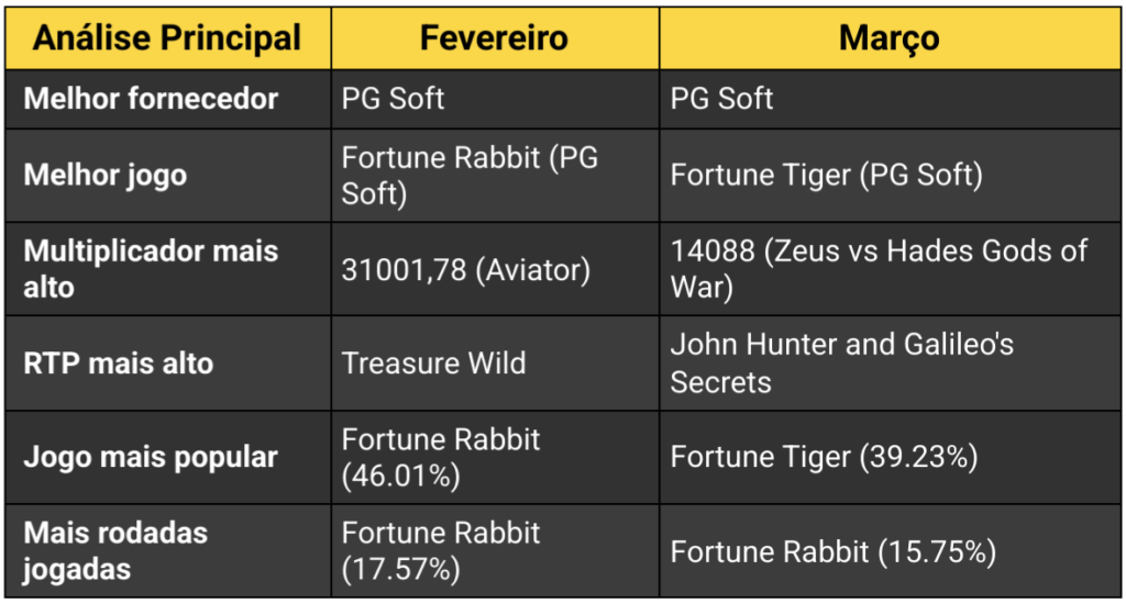 - Pragmatic Play consolidou sua estabilidade com o alto desempenho de Tigre Sortudo e a recuperação de Gates of Olympus, que voltou a crescer em popularidade no mês de março.