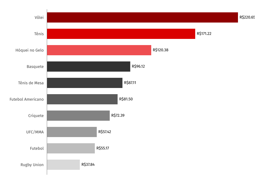 Esportes populares como Basquete (R$96.12), Tênis de Mesa (R$87.11, e Futebol Americano (R$81.5) também tiveram valores expressivos, enquanto modalidades como Críquete (R$72.39), UFC/MMA (R$57.42) e Rugby Union (R$37.84) mostraram um volume levemente menor de apostas médias.