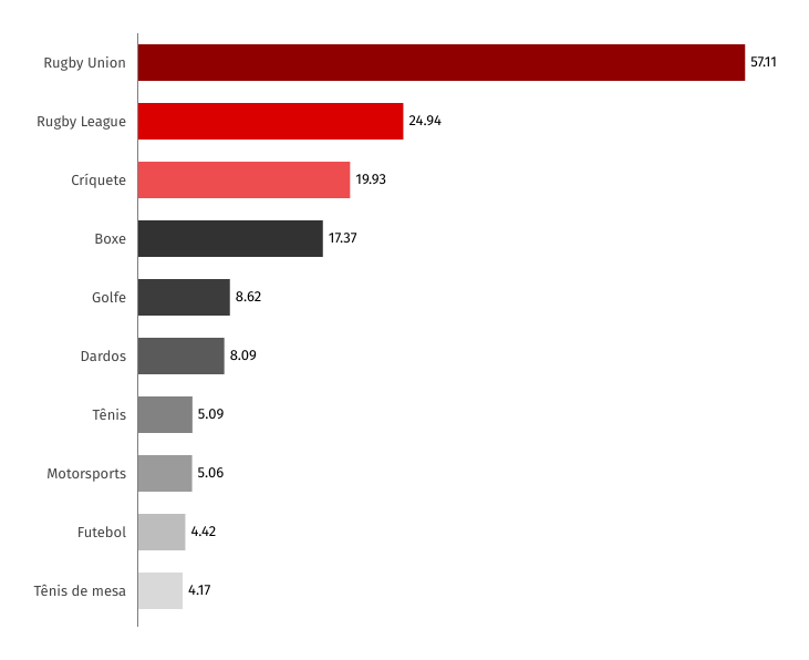 O Rugby League aparece também em alta, com 24.94 apostas diárias, mostrando que o rugby atraiu um grande público apostador em fevereiro. Na sequência, o Críquete aparece novamente, com uma média de 19.93 apostas por dia; o Boxe aparece na sequência com 17.37 das apostas diárias.
