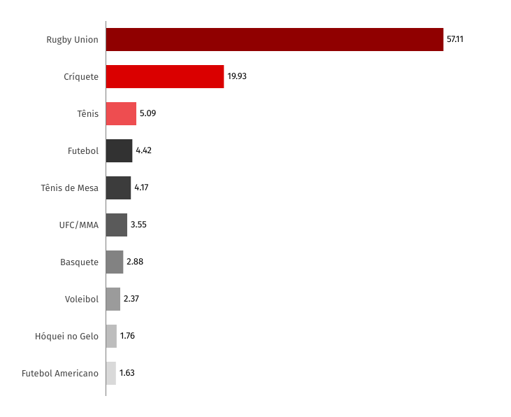 A análise da quantidade média de apostas diárias revela que o Rugby Union liderou com uma ampla margem, registrando uma média de 57.11 apostas por dia, consolidando-se como a modalidade com o maior média de apostas por jogador.