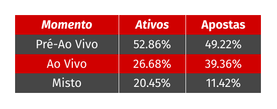 Percentuais considerando os valores totais de ativos e apostas para todos os esportes