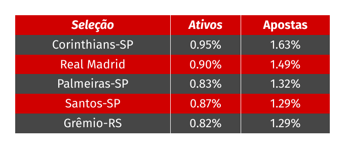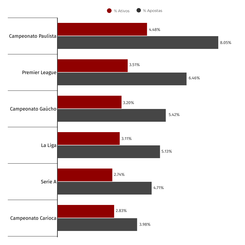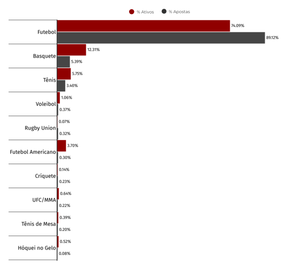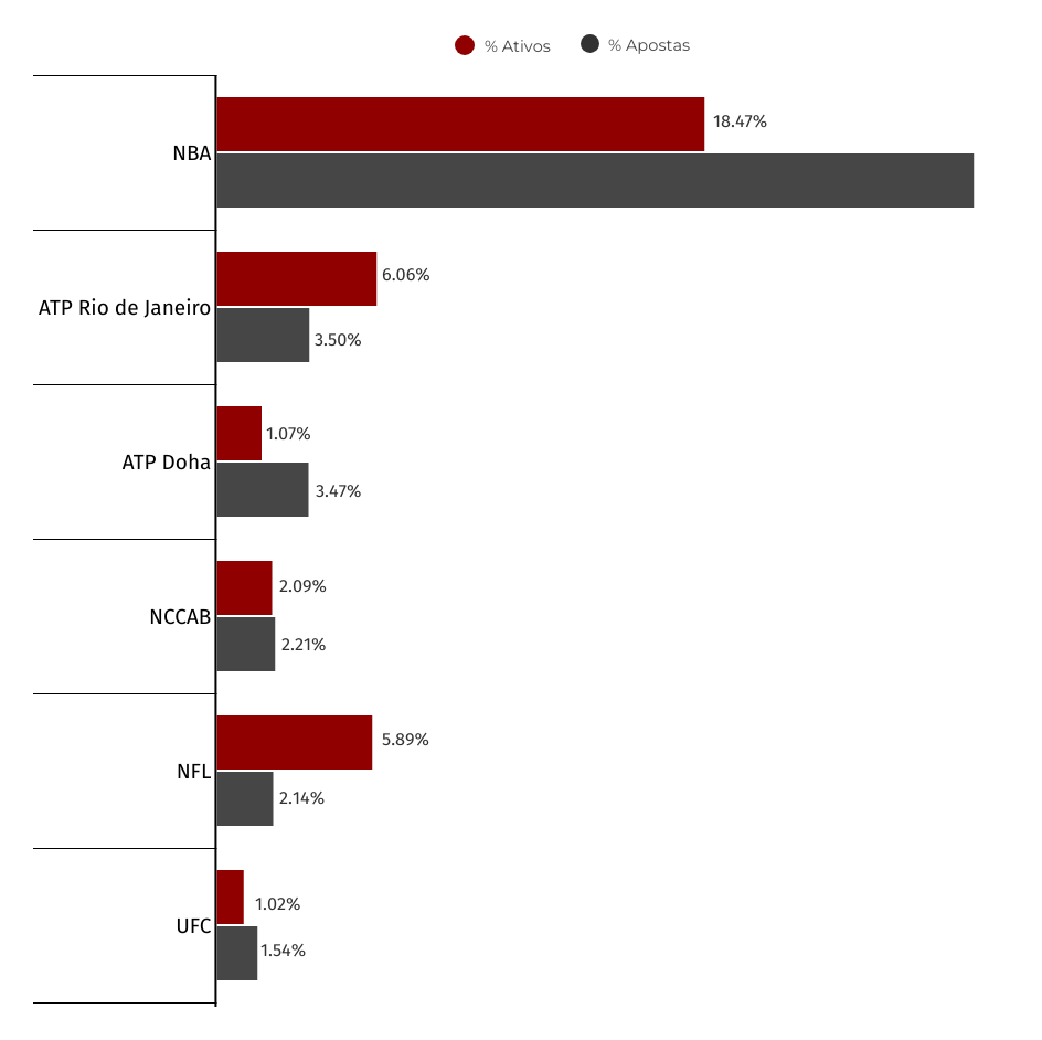 Percentuais considerando os valores totais de ativos e apostas de todos os campeonatos de todas as modalidades esportivas, exceto futebol