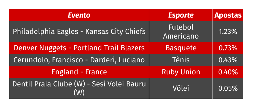 O confronto entre Philadelphia Eagles vs. Kansas City Chiefs pela NFL foi o evento mais apostado no futebol americano, com 1.23% das apostas no total.
