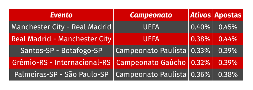 O confronto entre Manchester City vs Real Madrid, pela UEFA – assim como a partida de volta – foi o evento mais selecionado, com 0.40% dos usuários ativos e 0.45% do volume total de apostas.