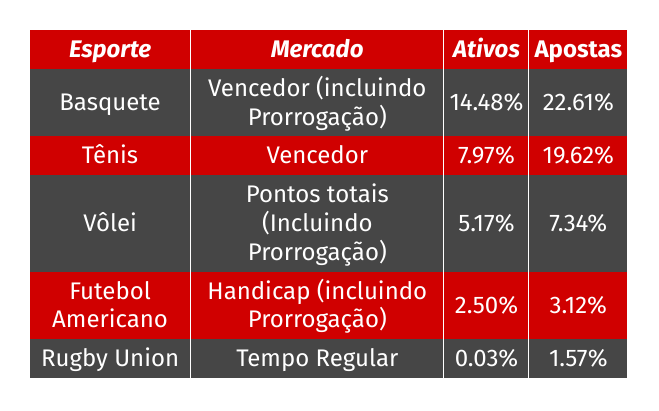 O basquete foi a modalidade mais expressiva, com o mercado de vencedor (incluindo prorrogação) representando 22.61% das apostas.