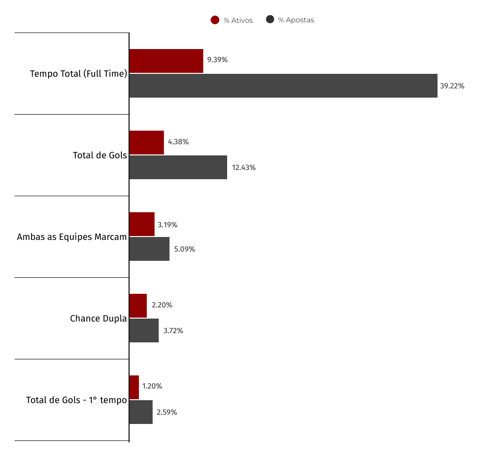 Já mercados como ambas as equipes marcam (5.09% das apostas) e chance dupla (3.72%) indicam que os apostadores buscam estratégias mais elaboradas para aumentar suas chances de ganho.
