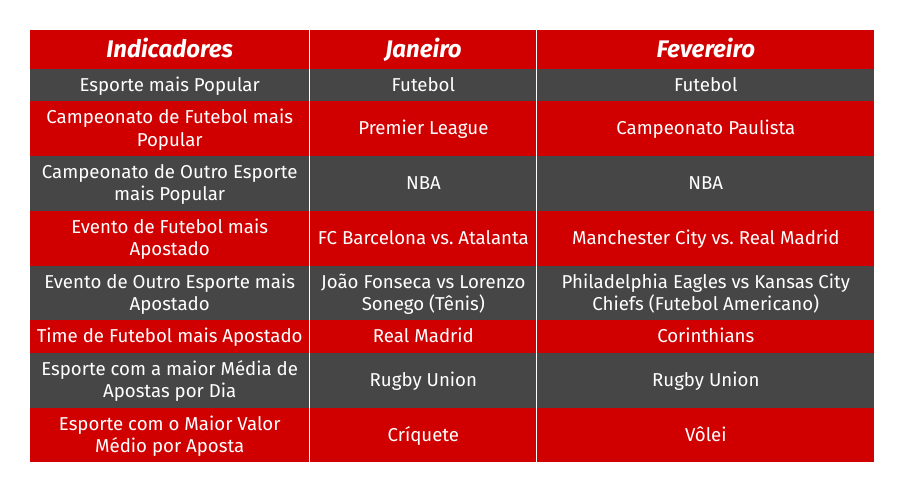 A lista abaixo traz os esportes que dominaram as apostas ao longo de fevereiro, com base no volume de ativos e apostas registrados ao longo dos meses: