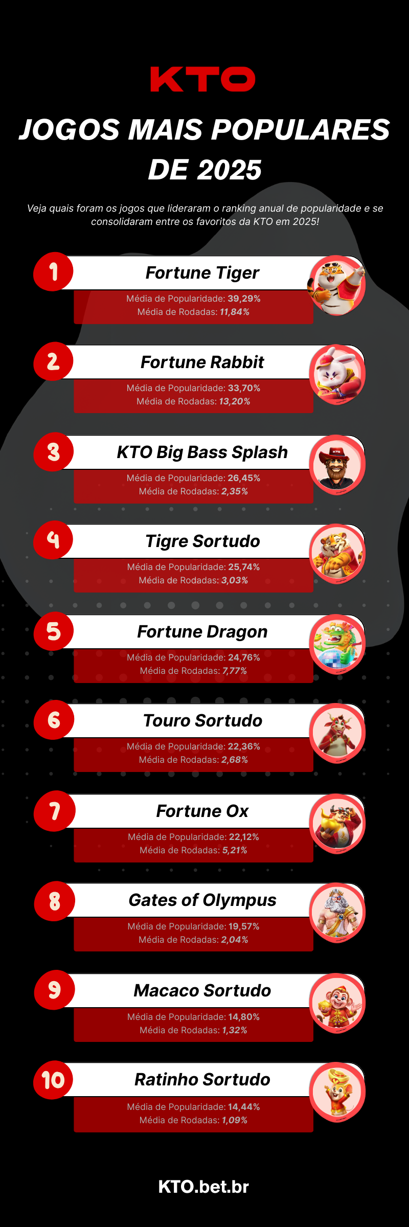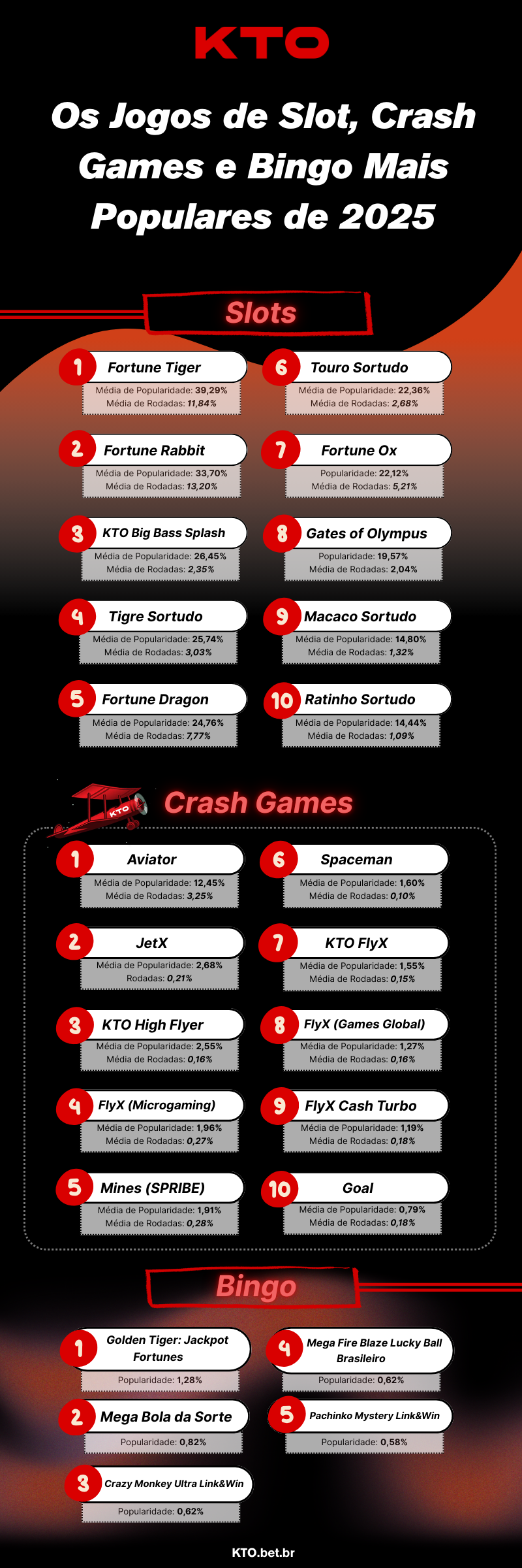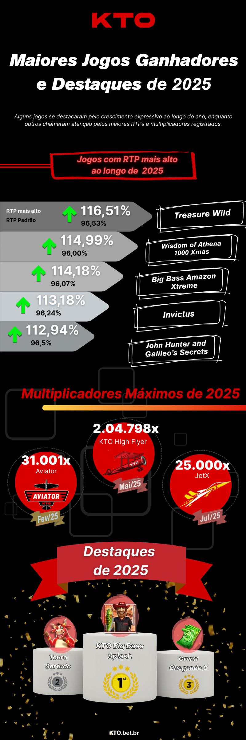 Veja a pesquisa anual com os jogos de cassino mais populares da KTO em 2025, destacando slots, crash games, cassino ao vivo, maiores RTPs, multiplicadores máximos e os jogos que mais cresceram no ano.