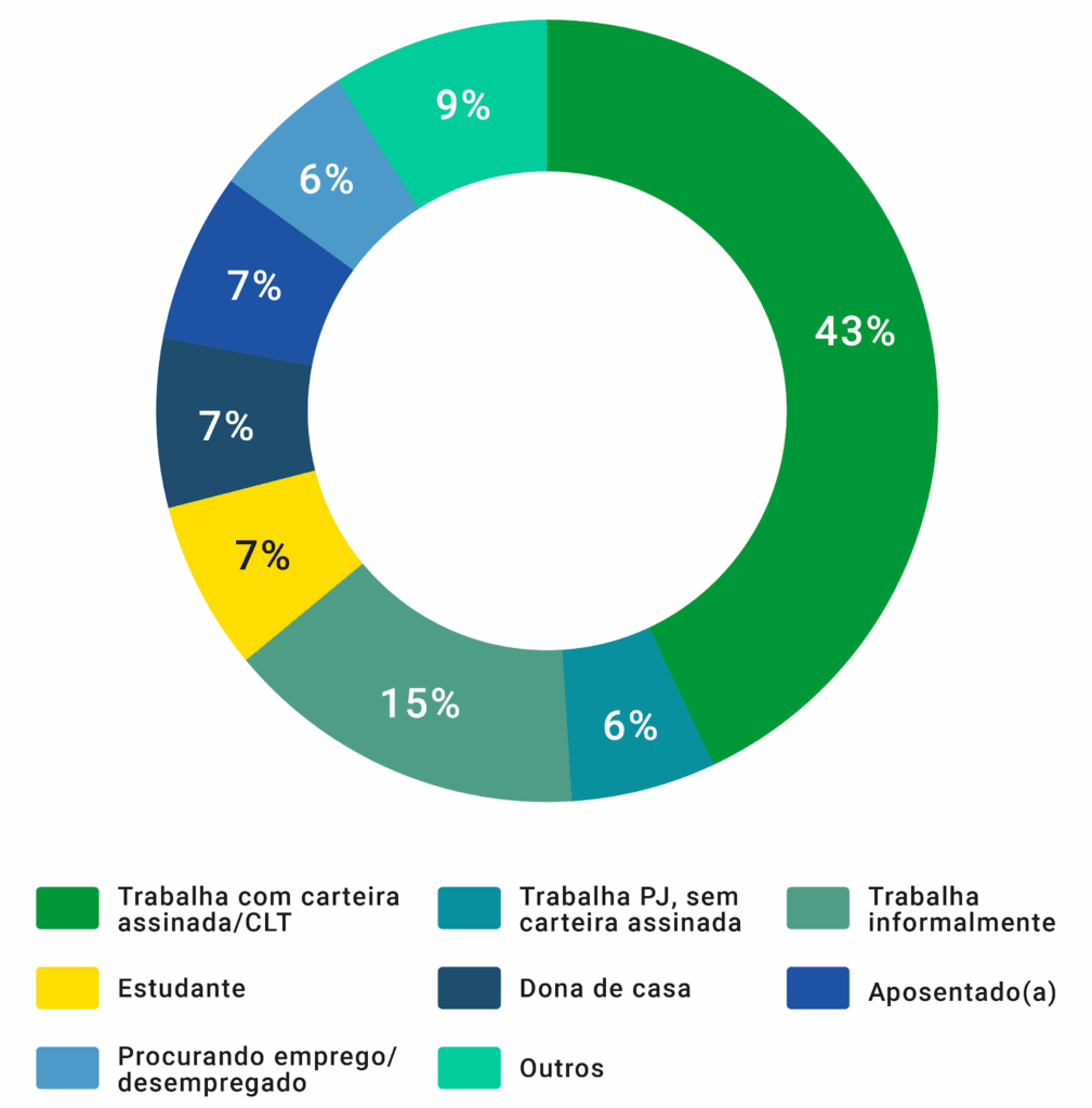 - Ocupação – Cerca de metade tem empregos estáveis, incluindo trabalho com carteira assinada (CLT) ou trabalhando como pessoa jurídica (PJ).