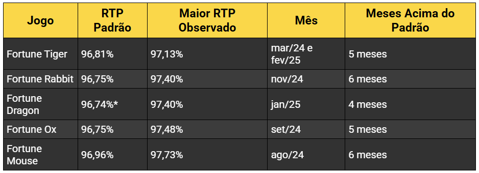 Veja abaixo os maiores RTPs observados para cada jogo da série entre março de 2024 e março de 2025: