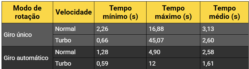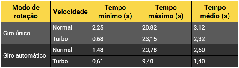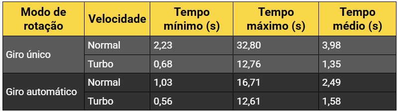 No modo automático, conseguimos giros ainda mais rápidos — chegando a 0,59 segundos no modo turbo, e mantendo estabilidade próxima de 2,6 segundos no modo normal.