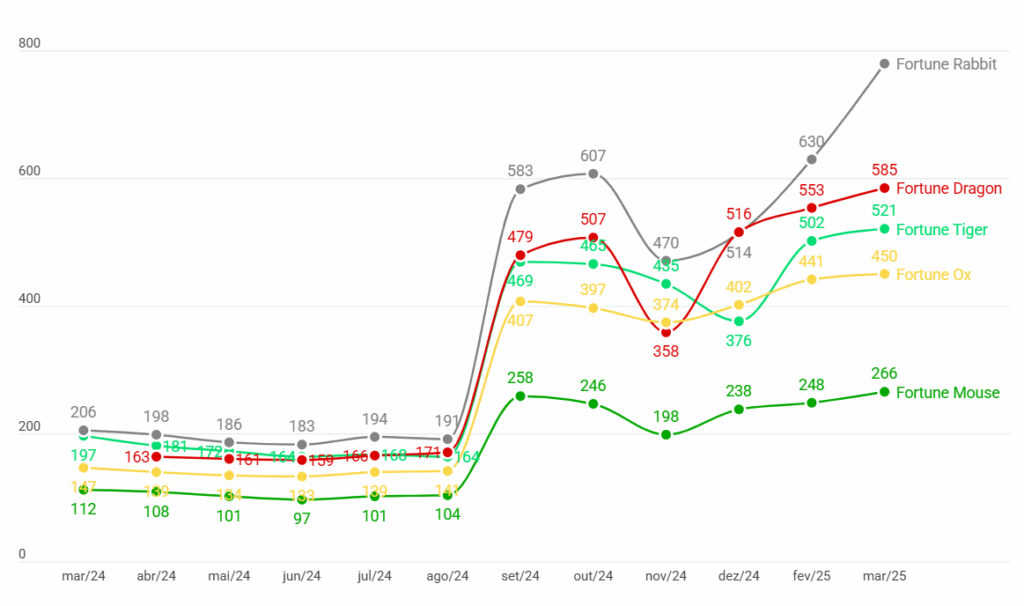 Fortune Rabbit alcançou 1139x já em março de 2024, enquanto o Fortune Ox ultrapassou a marca de 1800x em março de 2025.