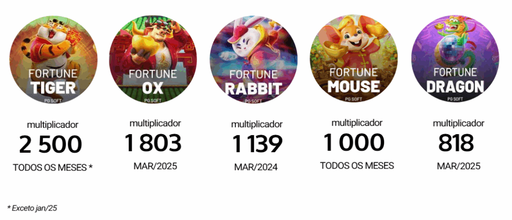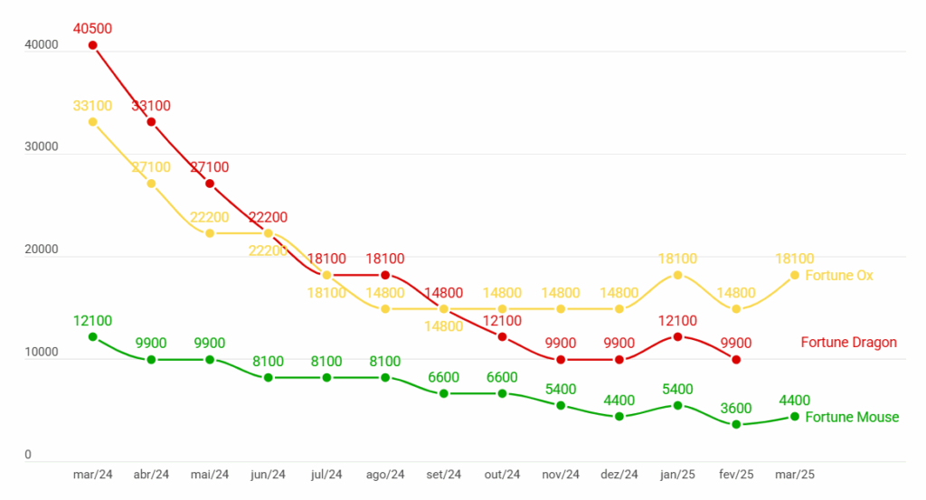 Já o Fortune Dragon, mais recente entre os títulos, atingiu 818x no mesmo mês. Por fim, o Fortune Mouse segue com uma performance constante, mantendo o multiplicador de 1000x todos os meses.