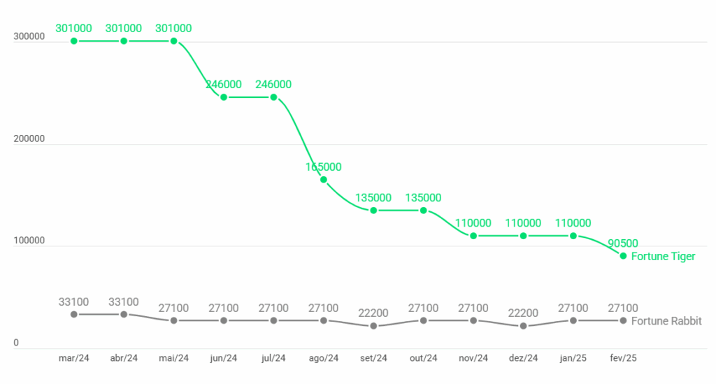 Não é surpresa que os dois títulos mais populares da série também lideram nas buscas orgânicas. O Fortune Tiger começou o período com um pico de 301 mil buscas mensais — volume que caiu gradualmente até chegar a 90,5 mil em fevereiro de 2025. Já o Fortune Rabbit se manteve estável entre 22 mil e 33 mil buscas mensais, mostrando consistência ao longo de todo o ano.