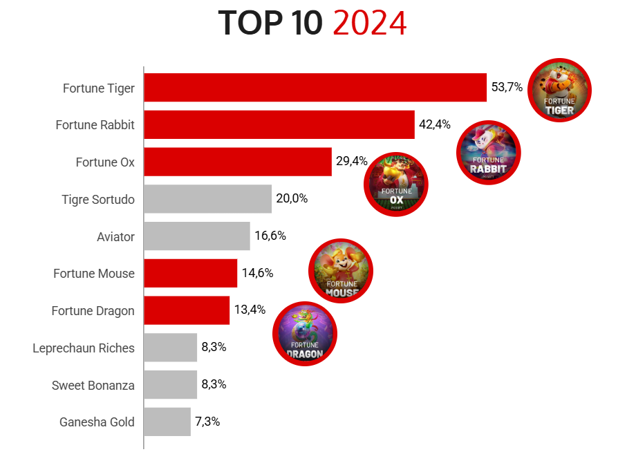 Fortune Ox conquistou 29,4%, à frente de clássicos renomados, e mesmo os “menores” da série marcaram presença: Fortune Mouse (14,6%) e Fortune Dragon (13,4%) também integraram o Top 10 geral de 2024.