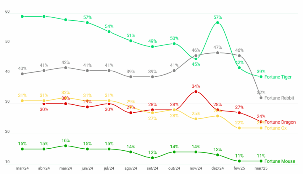 Mas o destaque aqui vai para o Fortune Dragon, que manteve popularidade estável de 8% ao longo de quase todo o ano, com pico de 9% em fevereiro de 2025. Já o Fortune Ox oscilou entre 6% e 8%, demonstrando regularidade.